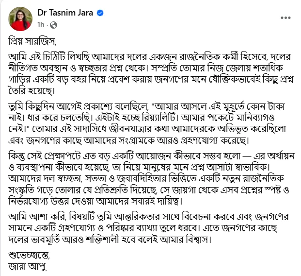 সামাজিক যোগাযোগমাধ্যম ফেসবুকে ডা. জারা লিখেন, ‘প্রিয় সারজিস, আমি এই চিঠিটি লিখছি আমাদের দলের একজন রাজনৈতিক কর্মী হিসেবে, দলের নীতিগত অবস্থান ও স্বচ্ছতার প্রশ্ন থেকে। সম্প্রতি তোমার নিজ জেলায় শতাধিক গাড়ির একটি বড় বহর নিয়ে প্রবেশ করায় জনগণের মনে যৌক্তিকভাবেই কিছু প্রশ্ন তৈরি হয়েছে। তুমি কিছুদিন আগেই প্রকাশ্যে বলেছিলে, “আমার আসলে এই মুহূর্তে কোন টাকা নাই। ধার করে চলতেছি। এইটাই হচ্ছে রিয়্যালিটি। আমার পকেটে মানিব্যাগও নেই।” তোমার এই সাদাসিধে জীবনযাত্রার কথা আমাদেরকে অভিভূত করেছিলো এবং জনগণের কাছে আমাদের সংগ্রামকে আরও গ্রহণযোগ্য করেছে।’