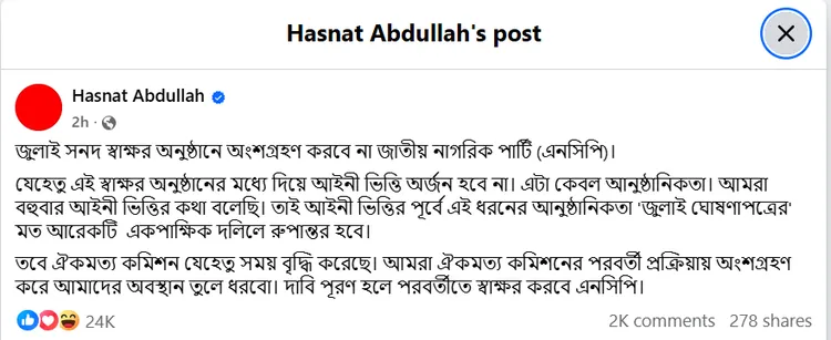 আজ সকালে হাসনাত আবদুল্লাহ তাঁর ফেরিফায়েড ফেসবুক অ্যাকাউন্টে লেখেন, ‘জুলাই সনদ স্বাক্ষর অনুষ্ঠানে অংশগ্রহণ করবে না জাতীয় নাগরিক পার্টি (এনসিপি)।’
